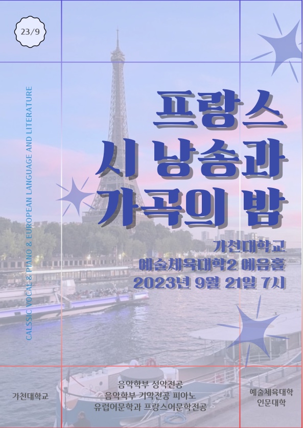 2023년 9월 21일 오후 7시에 예음홀에서 프랑스 시 낭송과 가곡의 밤이 진행됩니다.