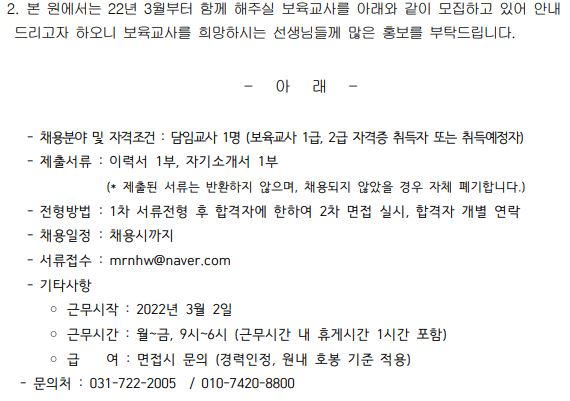 fnctId=bbs,fnctNo=1009 글번호 71030 위례 반디 협동어린이집 취업 안내 수정일 2022.02.07 작성자 이택민 조회수 719 등록일 2022.02.07 첨부파일 22-교사구인(가천대학교) 공문 서식.pdf 미리보기