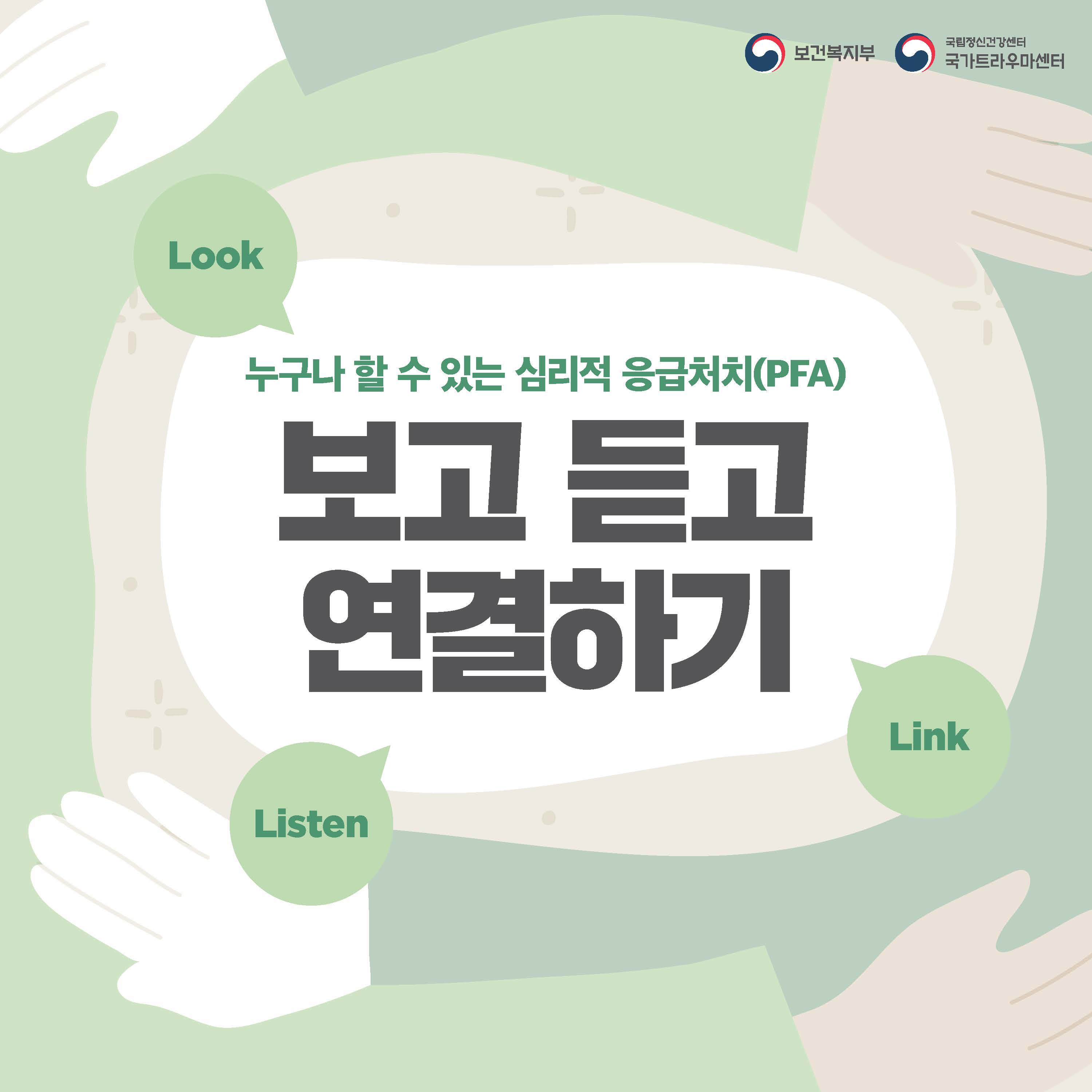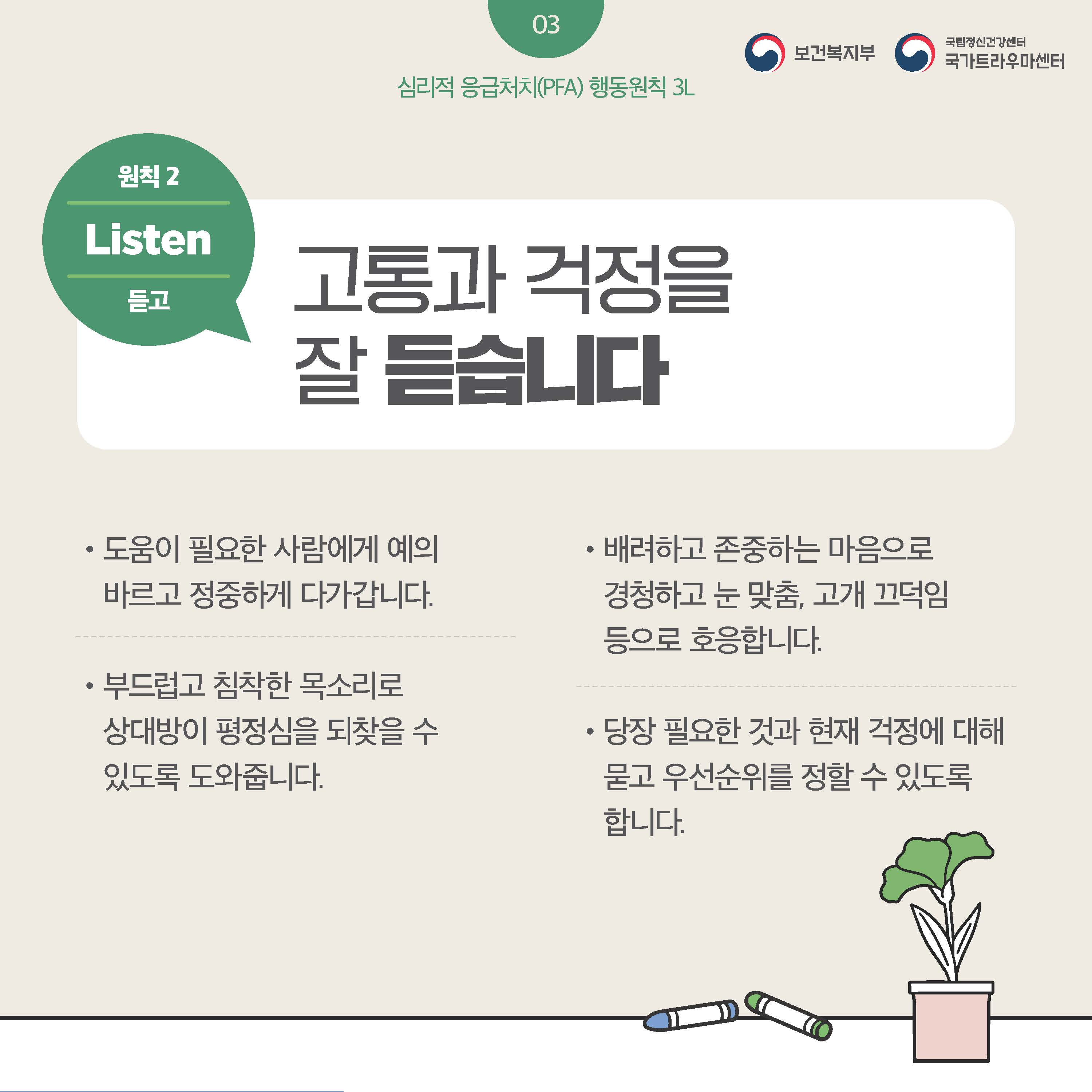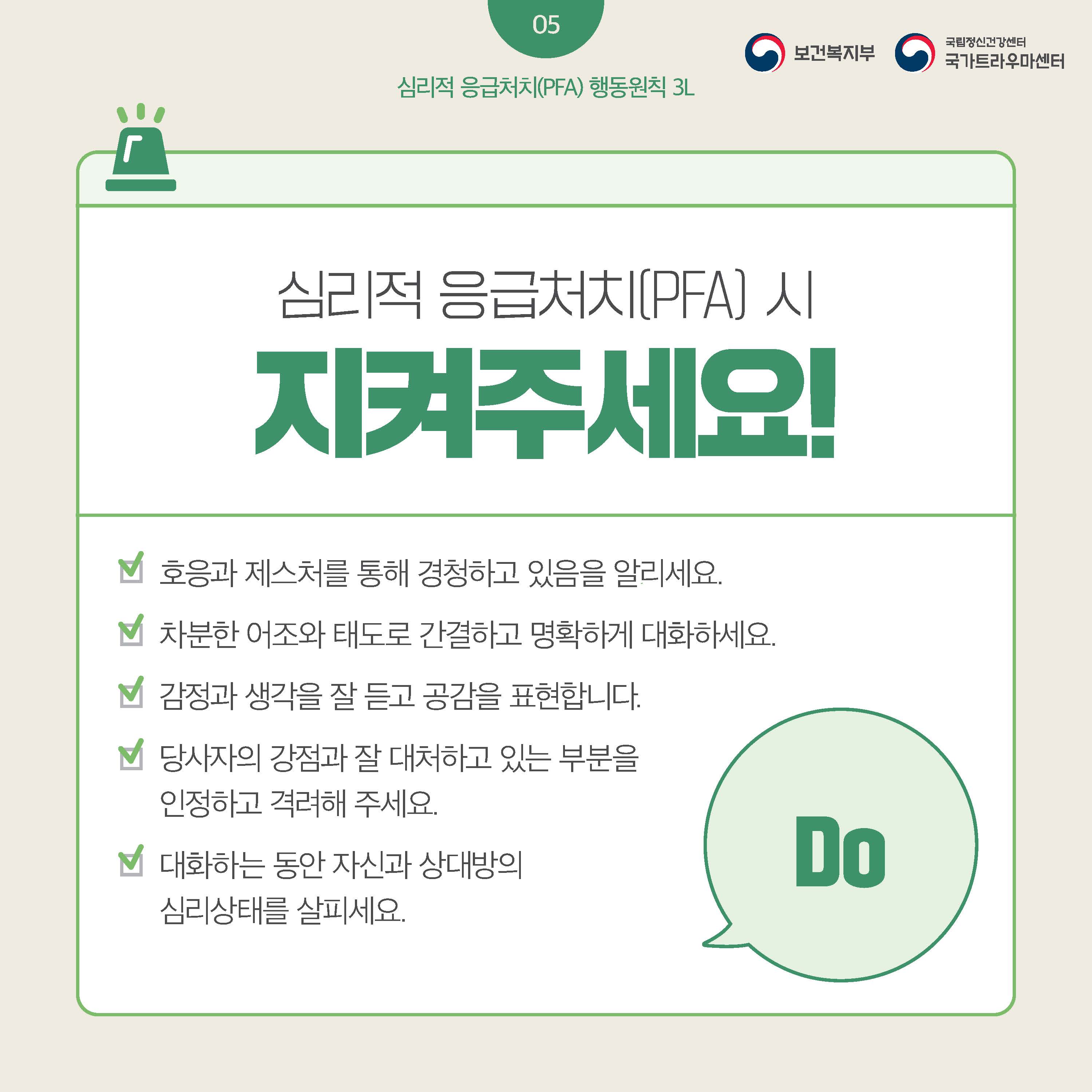 fnctId=bbs,fnctNo=445 글번호 106302 [정신건강] 누구나 할 수 있는 심리적 응급처치(PFA) 보고 듣고 연결하기 수정일 2025.02.12 작성자 학생상담센터 조회수 398 등록일 2025.02.12 출처: 보건복지부 국립정신건강센터
