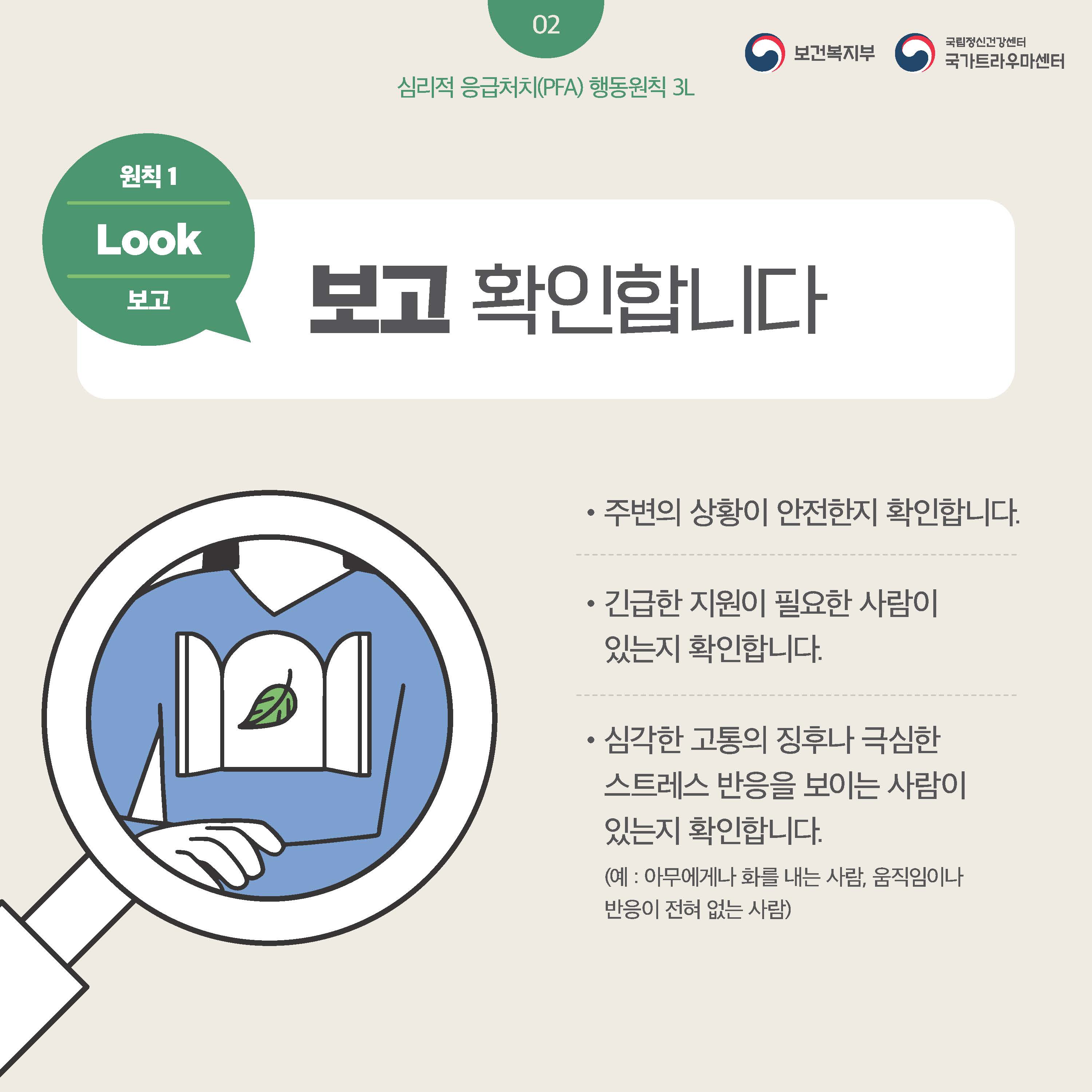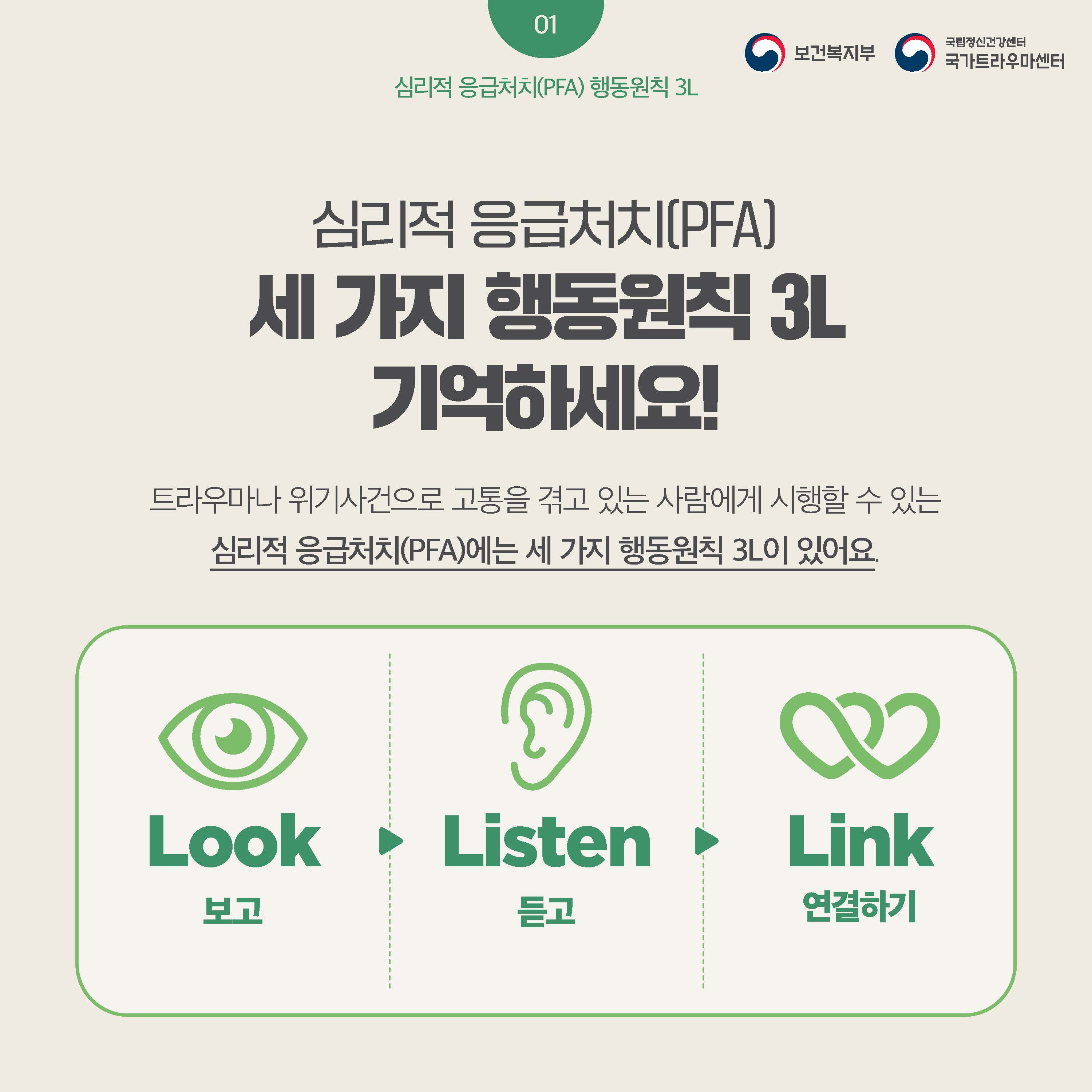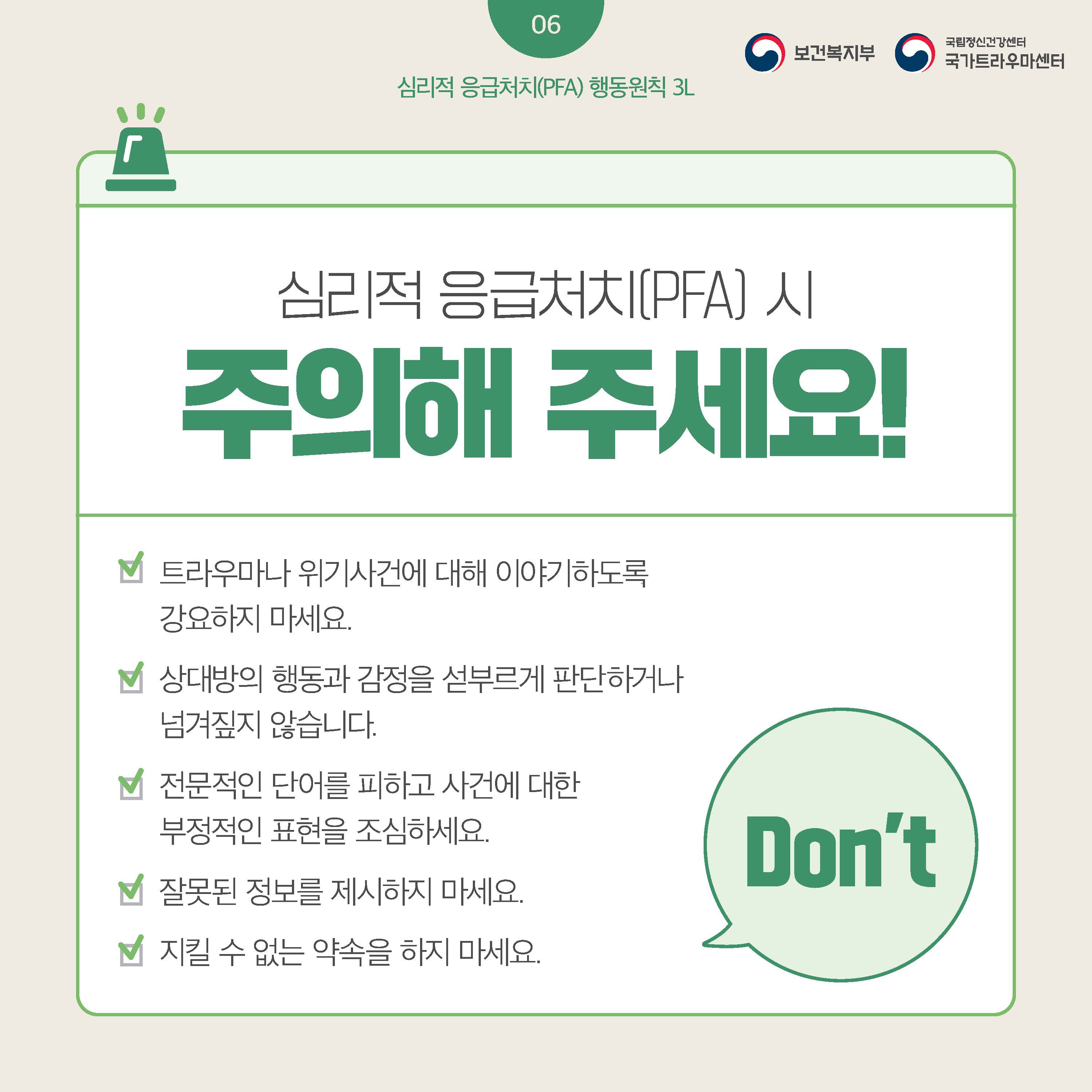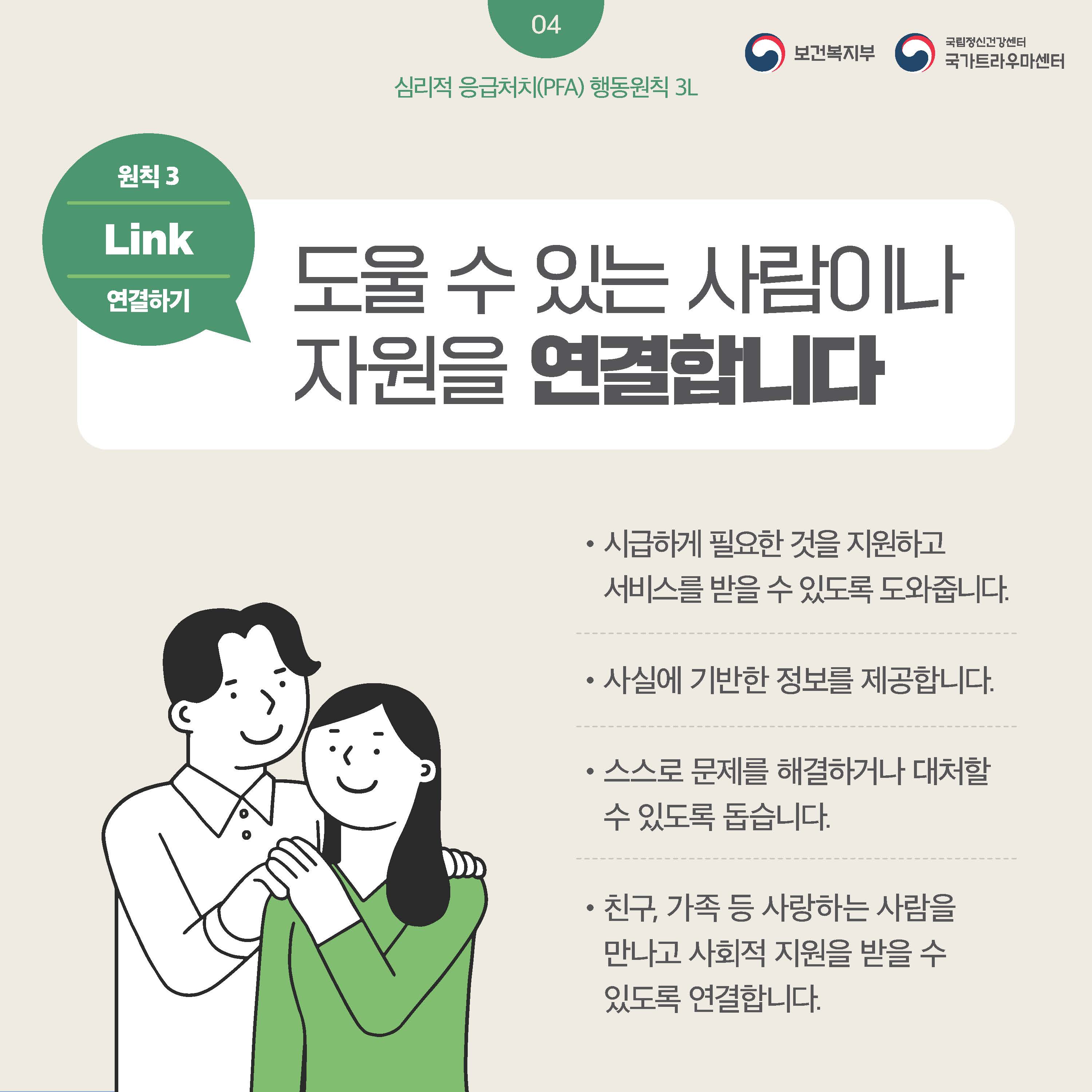fnctId=bbs,fnctNo=445 글번호 106302 [정신건강] 누구나 할 수 있는 심리적 응급처치(PFA) 보고 듣고 연결하기 수정일 2025.02.12 작성자 학생상담센터 조회수 398 등록일 2025.02.12 출처: 보건복지부 국립정신건강센터