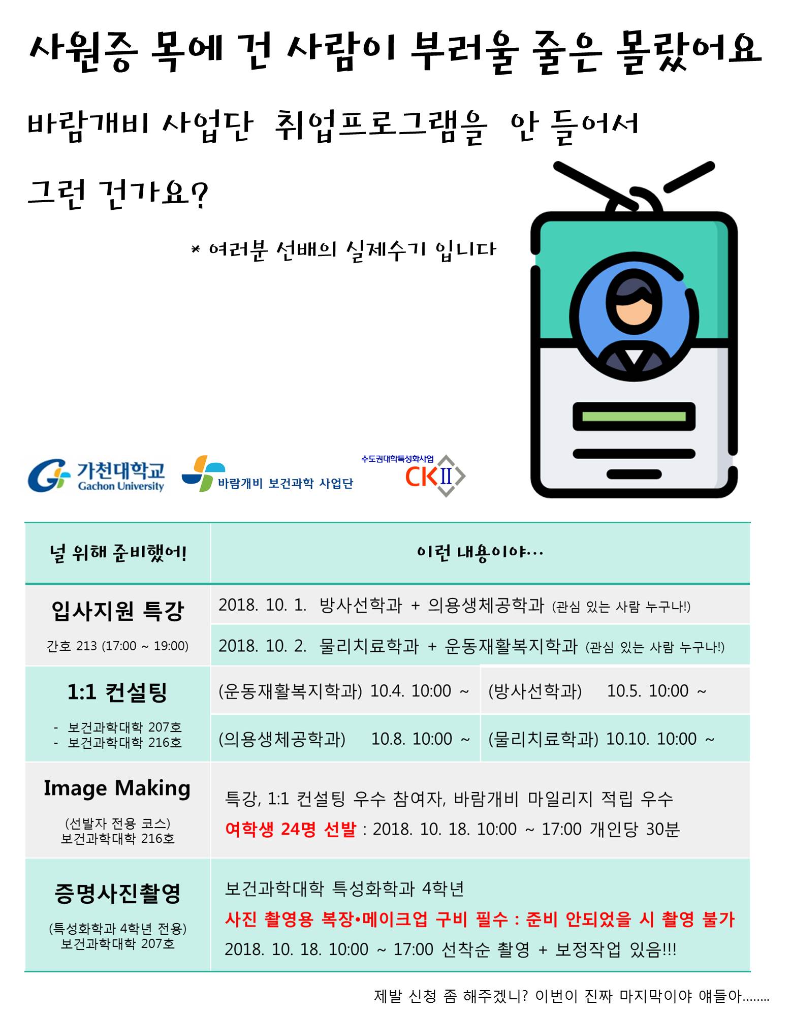fnctId=bbs,fnctNo=476 글번호 3896 [의과학대학] [특성화]특성화학과 3,4학년 대상 취업프로그램 운영안내 수정일 작성자 보건과학대학 조회수 1555 등록일 2018.09.28